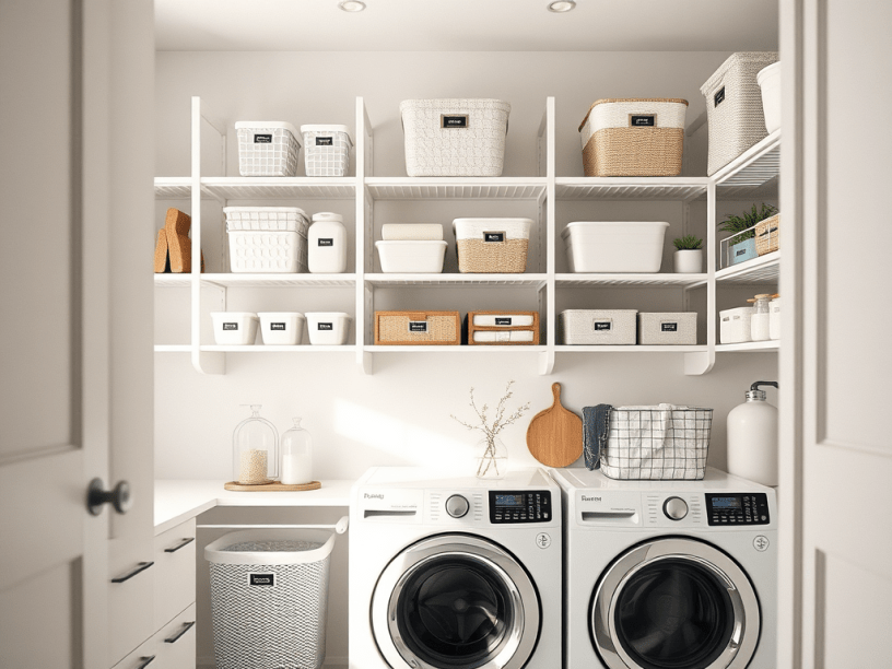 To maintain a minimalist aesthetic, consider using uniform containers or baskets on the shelves. This creates a clean, cohesive look and prevents visual clutter. Clear or labeled containers are a great choice for organizing laundry pods, clothespins, or stain removers. The key is to keep your shelves functional and uncluttered, so only store what you regularly use.
